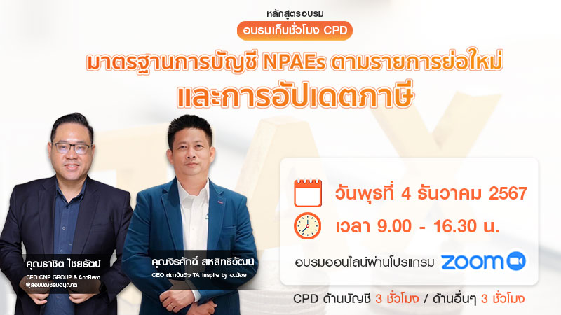 👨🏫การอบรมเก็บชั่วโมง CPD ออนไลน์ หลักสูตร “มาตรฐานการบัญชี NPAEs ตามรายการย่อใหม่และการอัปเดตภาษี”